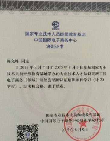 帝壹网络创始人获得:中国国际电商务中心-电子商务(领域)网络营销师称号